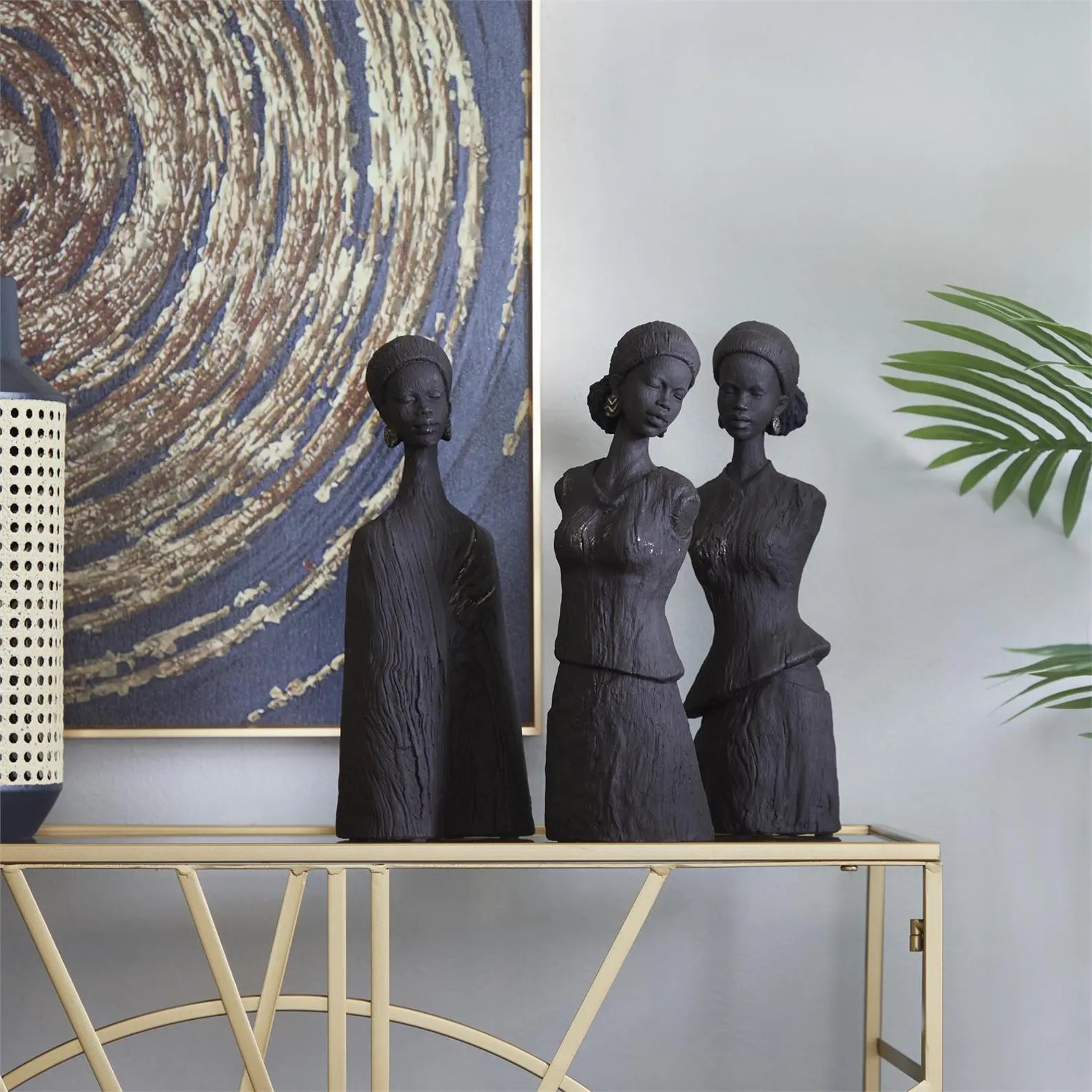The Black Polystone Women features three elegant sculptures celebrating the beauty and strength of African womanhood. Crafted from durable polystone with a matte black finish, each figure showcases graceful detail and individuality, making them a striking addition to any home.